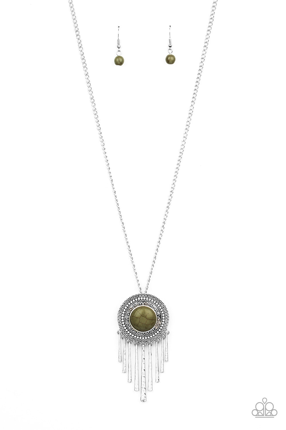 An earthy green stone is pressed into the center of a shimmery silver disc radiating with glistening tribal details. Swinging from the bottom of a lengthened silver chain, the bold pendant gives way to a fringe of delicately hammered silver rods for a wanderlust finish. Features an adjustable clasp closure.